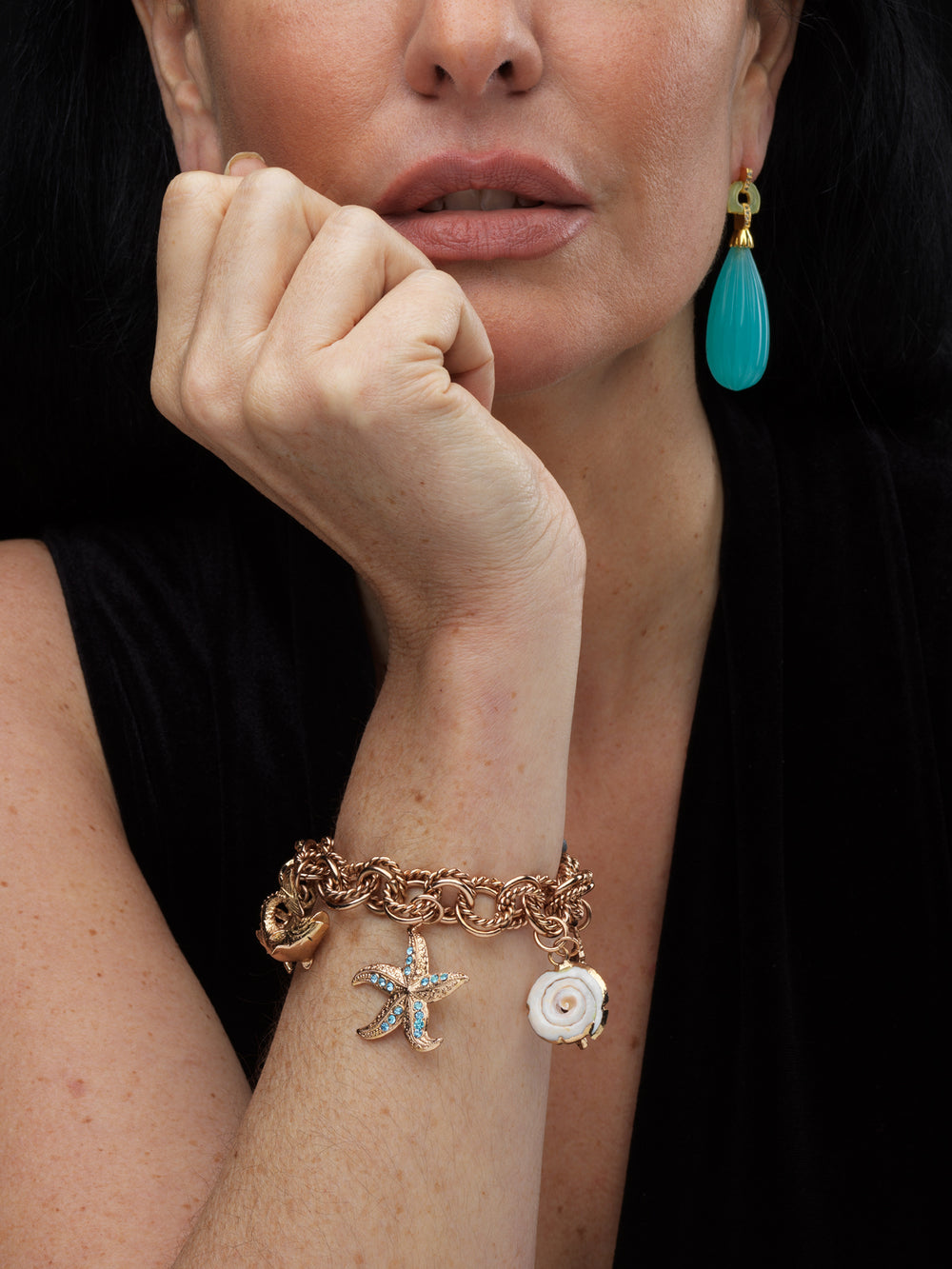 Designed as a heartfelt tribute to the sea, this bangle carries charms that are fragments of cherished memories, evoking the warmth of sunlit holidays. Each pendant whispers golden moments spent on sun-soaked sands, where time seems to pause. The charms sway gently like ocean waves, truly a jewel of emotion and nostalgia.
