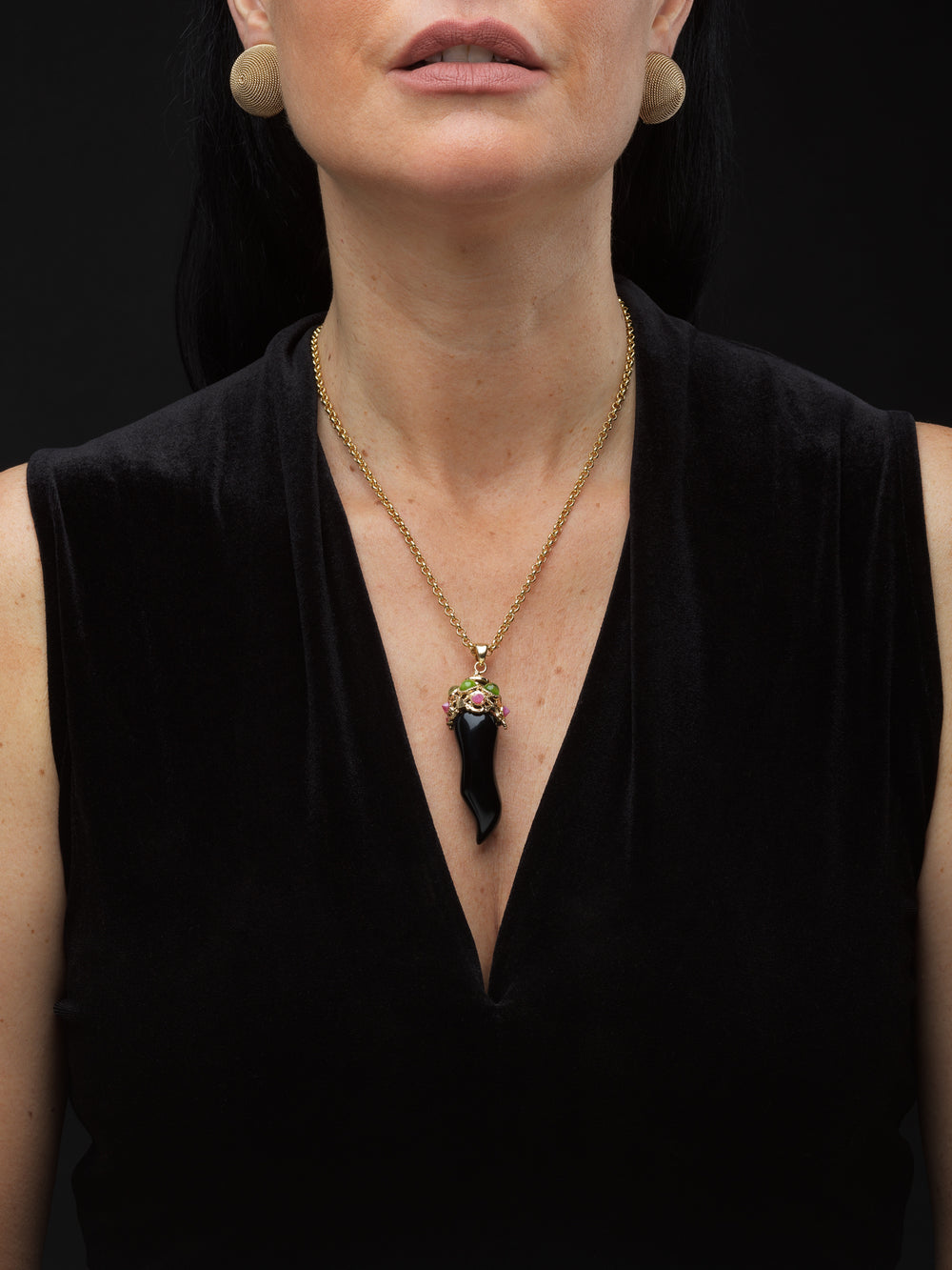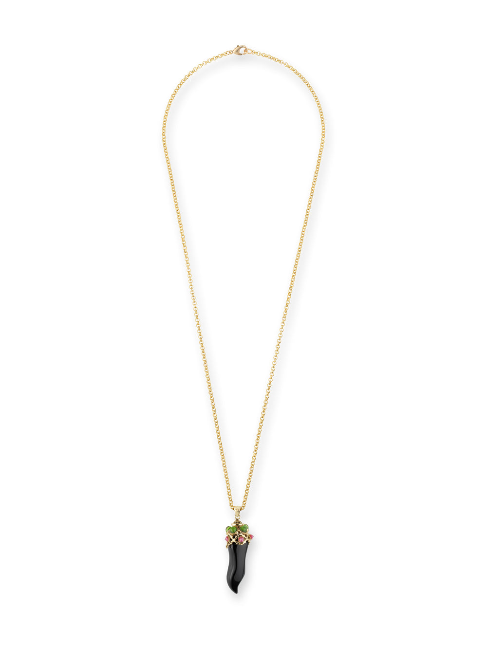 Collier avec corne en onyx noir fait à la main, chaîne plaquée or et inserts en pierres d'aigue-marine. Cette pièce est une interprétation moderne du "cornicello", un talisman italien emblématique pour protéger contre le mauvais œil tout en symbolisant historiquement la fertilité et la virilité.