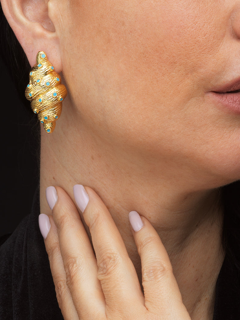 Shell-cut stud earrings adorned with turquoise paste elements, crafted from alloy and finished with a luxurious 24-karat yellow gold plating.