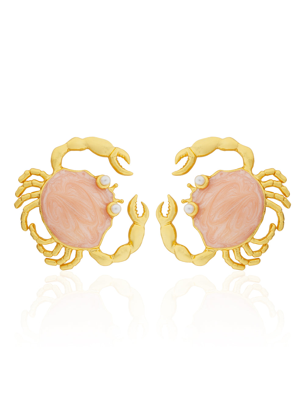 Crab-cut stud earrings, handcrafted in pink enamel.