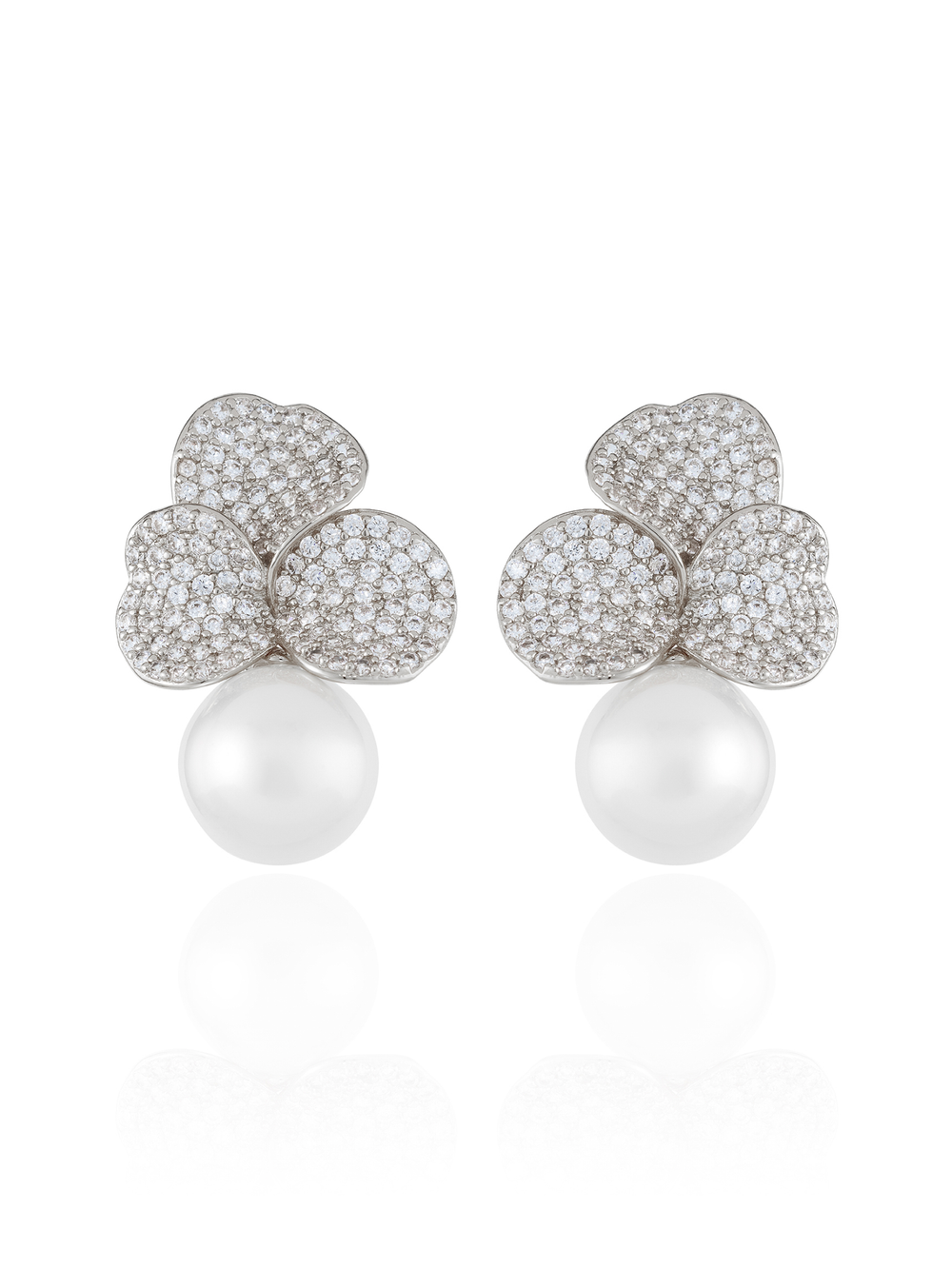 Rhodium-plated stud earrings with white zirconia and synthetic cultured pearls.