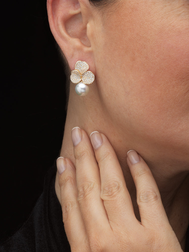 Gracefully timeless, these gold-plated studs shimmer with white zircons and delicate synthetic cultured pearls.