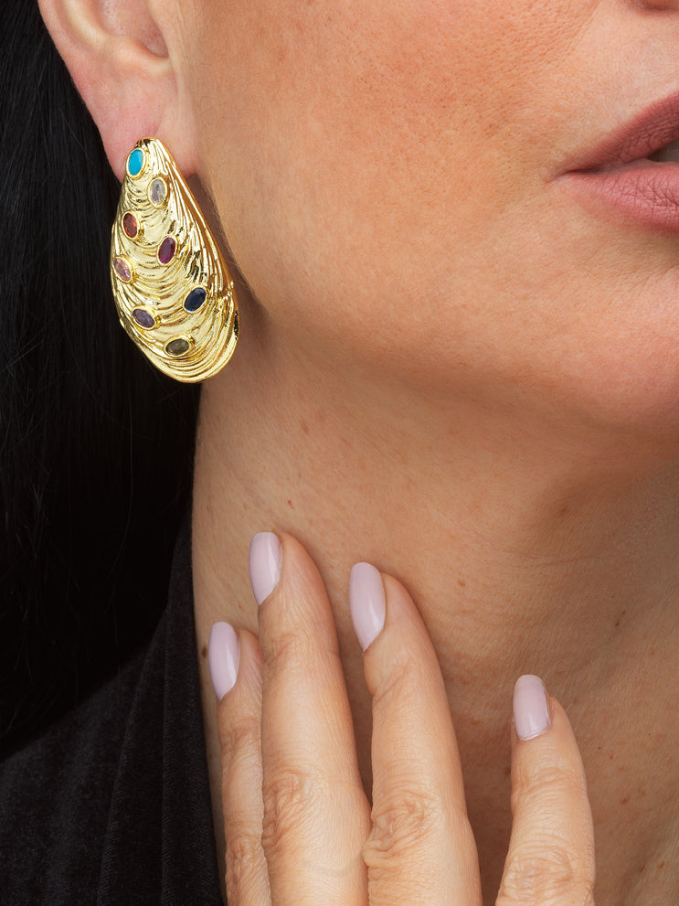 Echoing the treasures of a sunlit shoreline, these earrings capture the delicate beauty of seashells scattered by the tide. The sparkle of colored zircons adds a playful, luminous touch, each stone a reminder of the ocean’s ever-changing hues and hidden wonders.