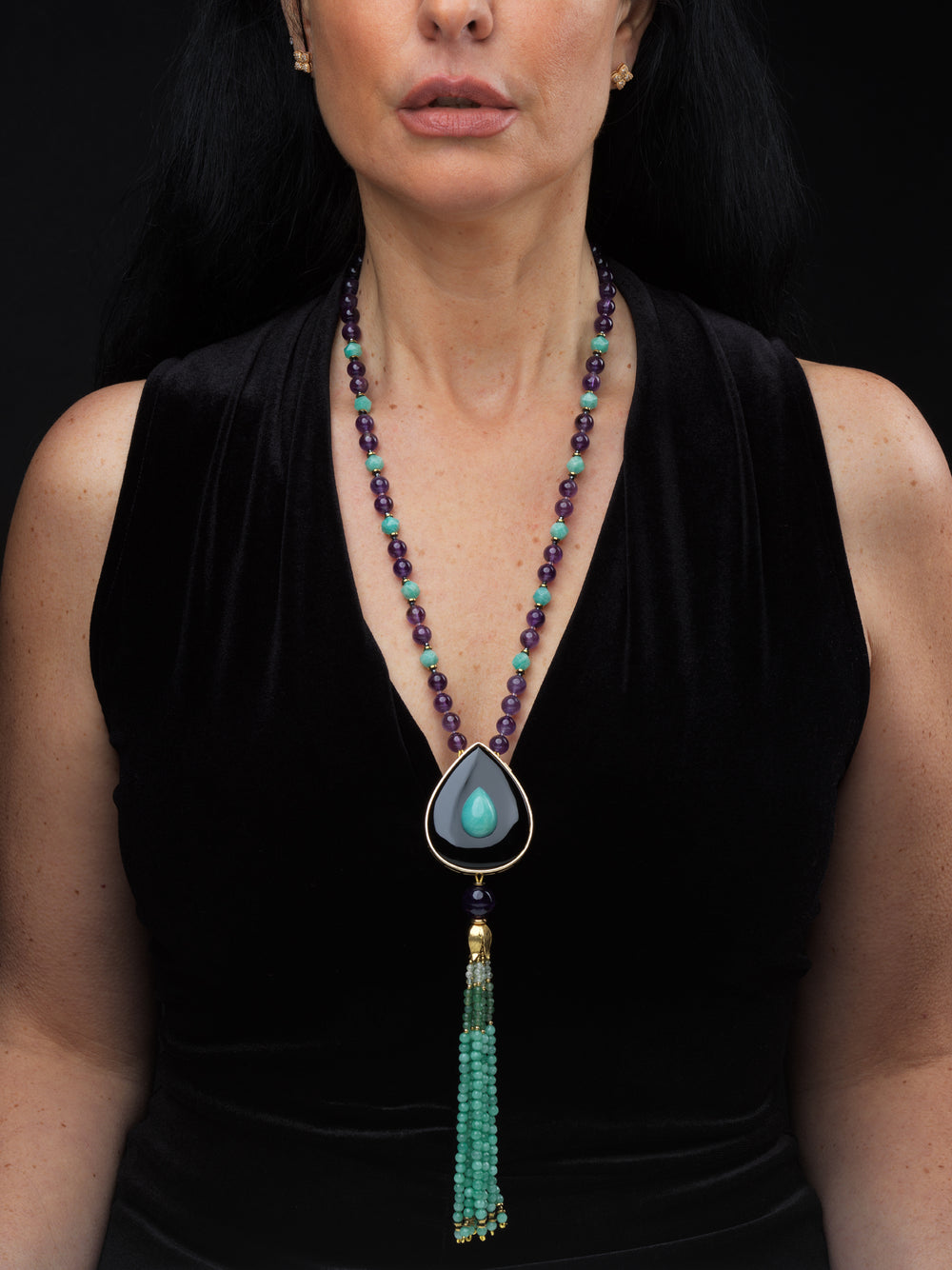 Featuring a bold central onyx crowned with a delicate larimar drop, and framed by vibrant 8mm amethyst and chrysoprase stones. The full-length, hand-knitted necklace is accented with silver elements plated in gold.