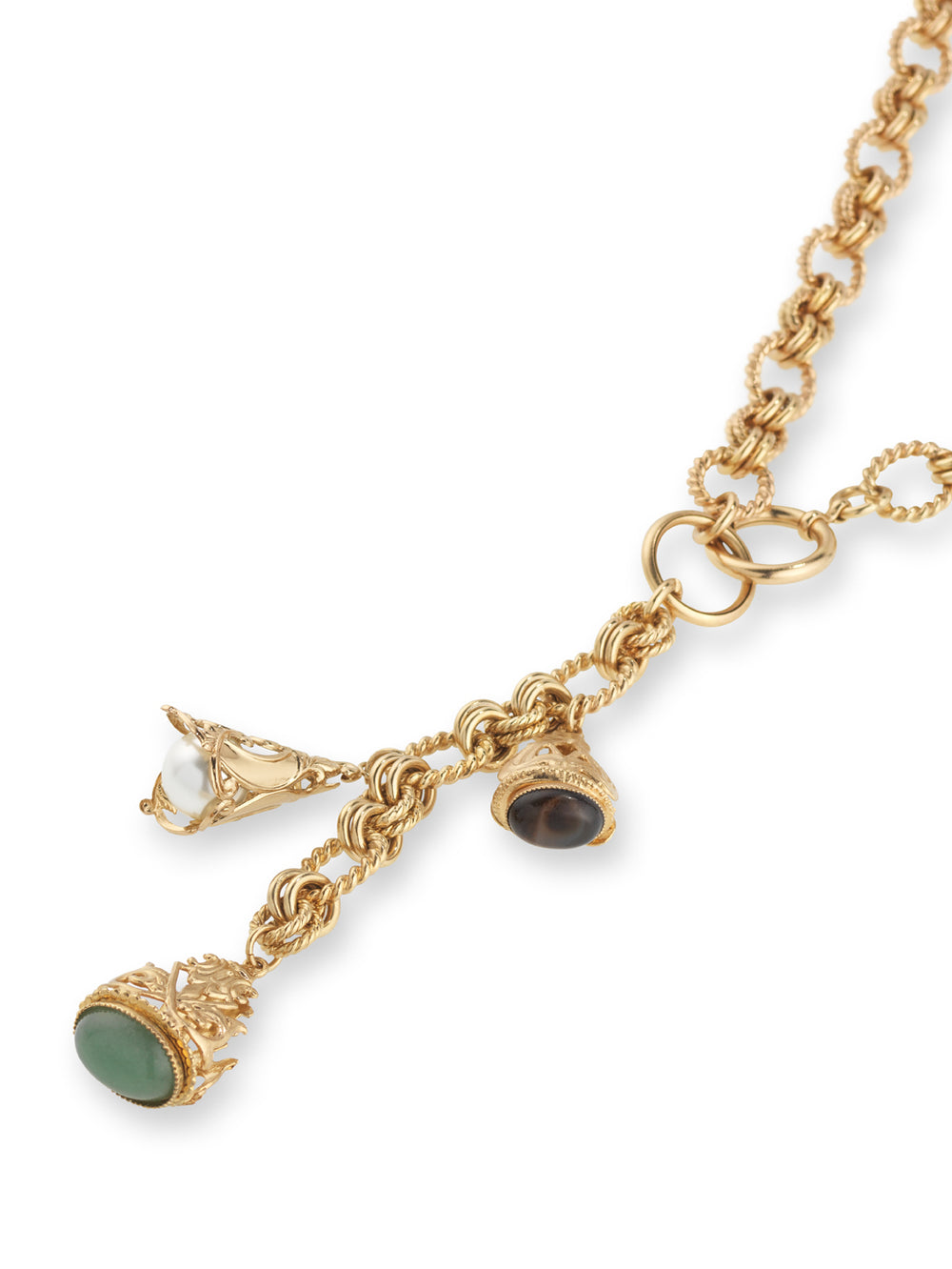 Collier long fait à la main en demi-rouge, inspiré du design florentin des années 1930-1940. Présentant de la chrysoprase, de l'onyx et des perles de Majorque.
