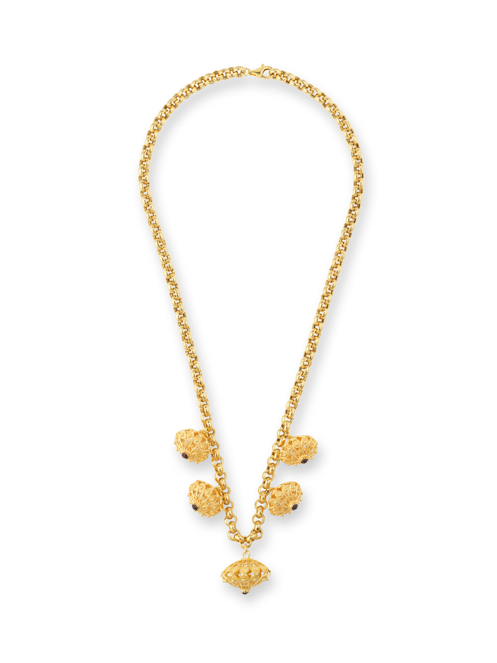 Revisited traditional Sardinian filigree necklace crafted from 925 sterling silver and plated in 18-karat gold, featuring five vibrant garnet stones.