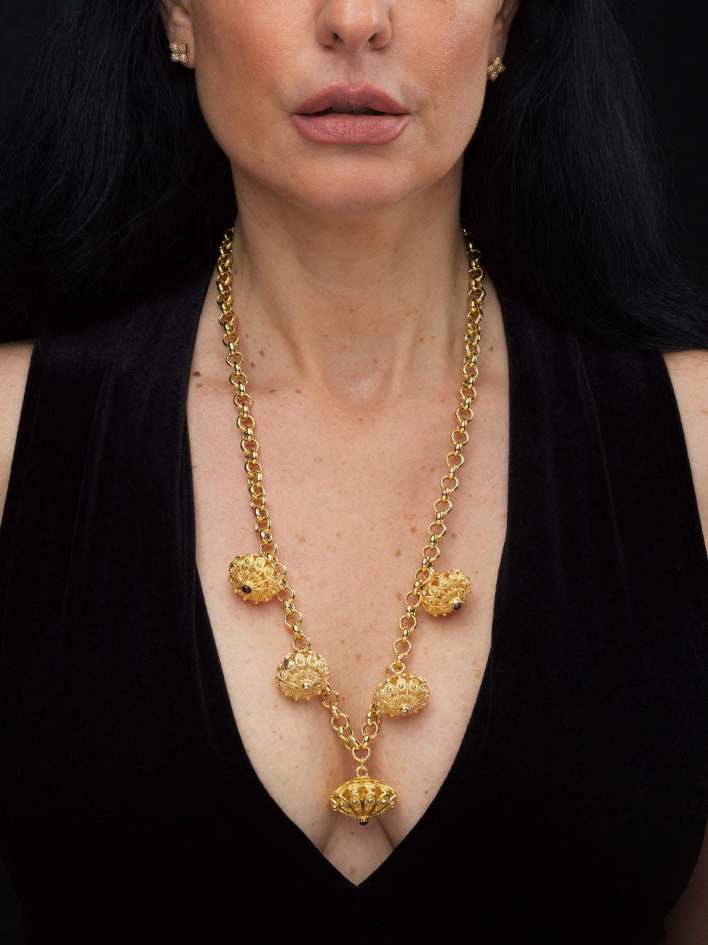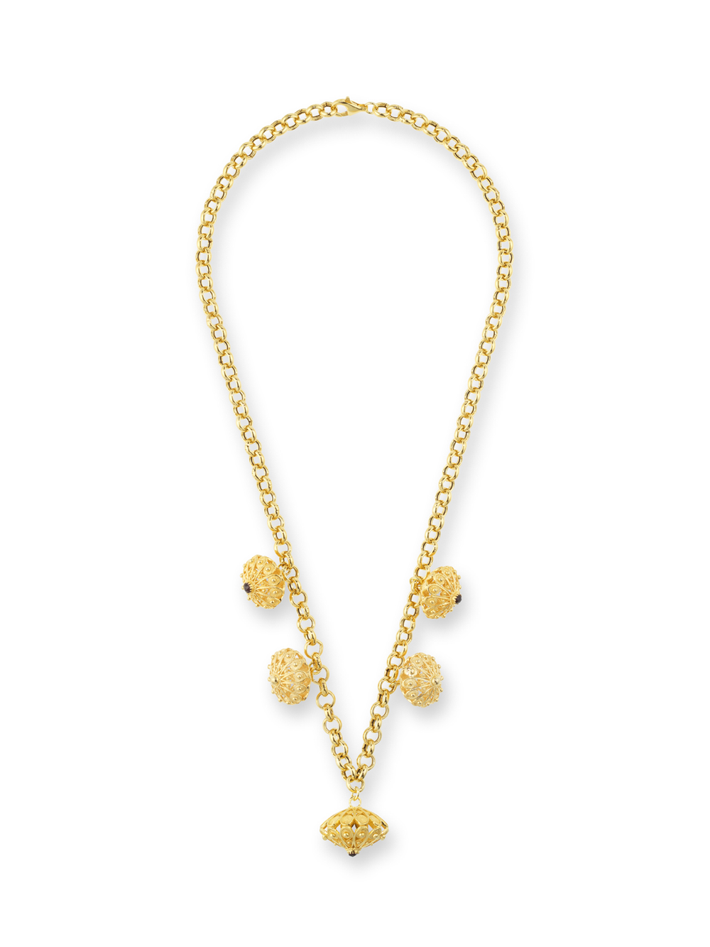 Reimagined traditional Sardinian filigree necklace crafted from 925 sterling silver and plated in 18-karat gold, adorned with vibrant garnet stones.